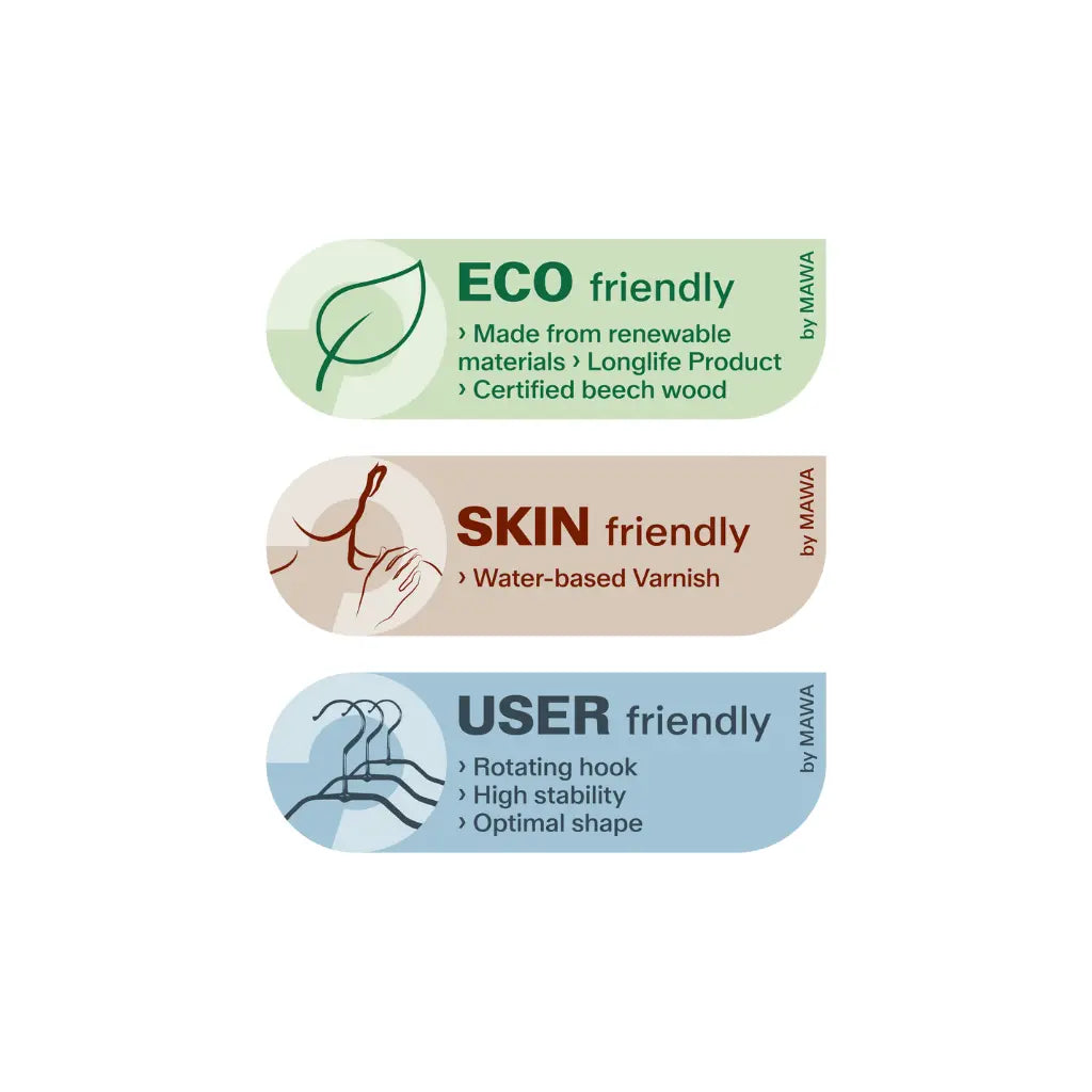 MAWA Holzbügel sind perfekt für die sichere Aufbewahrung Ihrer Kleidung. Durch ihre optimale Form geben Sie Halt, verhindern Verformungen und sorgen für faltenfreie Aufbewahrung, sowohl für schwere Wintermäntel wie feine Blusen.