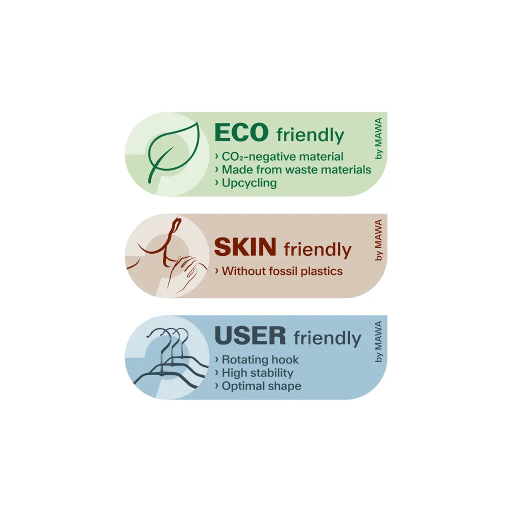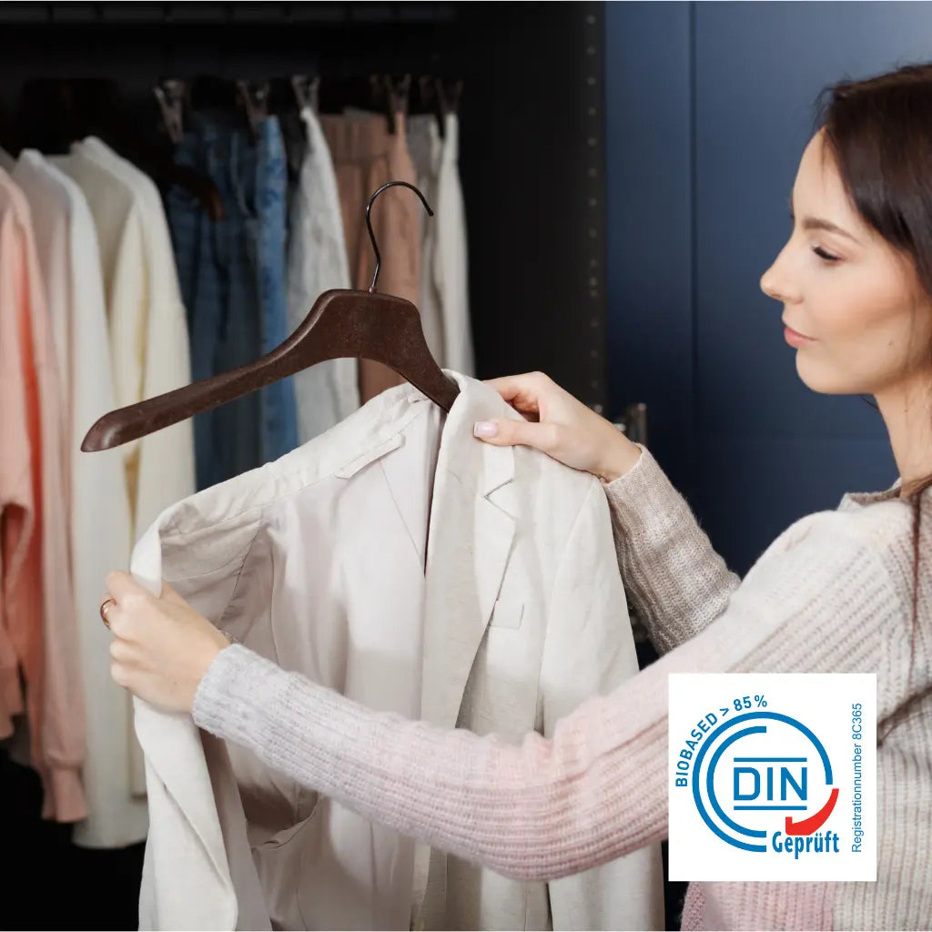 Das Besondere am MAWA C-Cycle ist sein Beitrag zum Klimaschutz. Durch die Nutzung organischer Reststoffe bleibt der pflanzliche CO₂-Speicher erhalten und schützt so aktiv die Umwelt. Die Qualität unseres C-Cycle Kleiderbügels wird durch das DIN-Geprüft-Zeichen für Produkte aus über 85 % biogenen Materialien bestätigt (Registernummer 8C365). Mit dem C-Cycle entscheiden Sie sich nicht nur für einen Kleiderbügel, sondern für ein Produkt, das neue Maßstäbe im Bereich nachhaltiger Konsumgüter setzt.