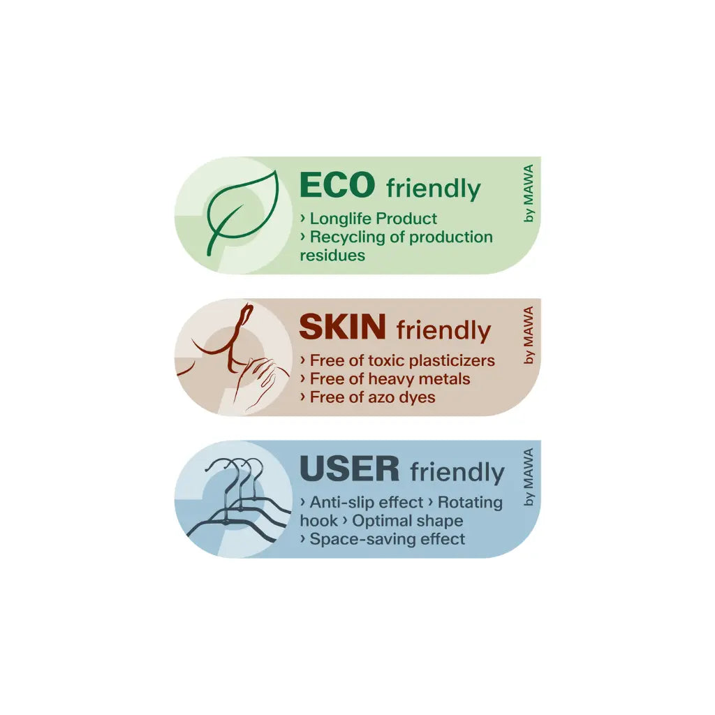 Metallkleiderbügel von MAWA sind aus vielen Gründen eine nachhaltige Wahl. Wir produzieren seid 1948 in Deutschland und optimieren unsere Produktion immer weiter, um noch umweltschonender zu fertigen. Unsere Produktionsabfälle werden recycelt und wir verwenden für unsere Antirutschbeschichtung ausschließlich PVC ohne gesundheitsgefährdende Weichmacher (Phtalatfreiheit nach DIN EN ISO 18856, RoHS-Richtlinie nach DIN EN 62321-3-1).