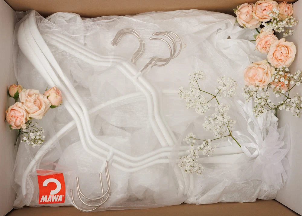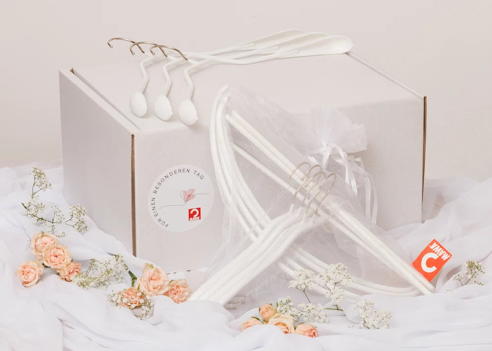 Que ce soit pour les mariés ou pour surprendre avec élégance le témoin et ses amis, ces cintres de haute qualité mettent parfaitement en valeur la robe et le costume de mariée et offriront au couple des années de plaisir dans leur garde-robe. Du matin au soir, jusqu'à la séance photo : avec l'ensemble de mariage MAWA, les tenues restent impeccables et élégamment présentées.